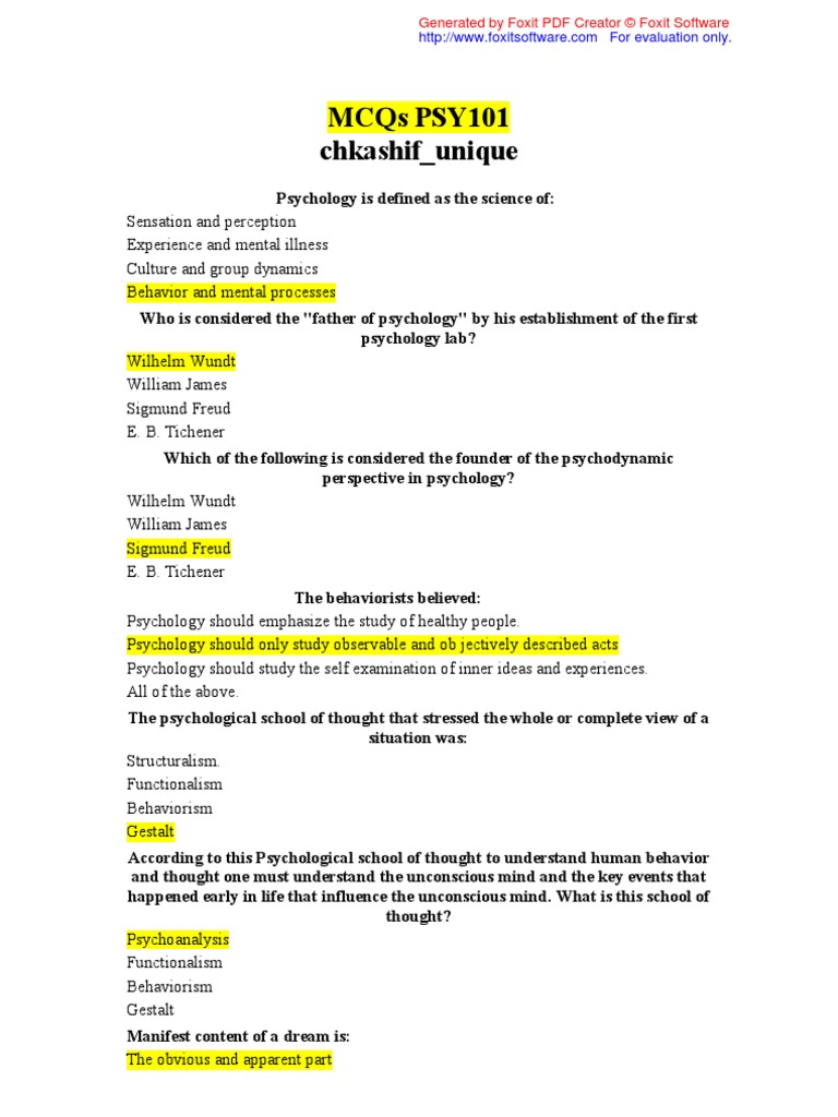 Solved Mcqs Of Psy101 Pdf Psychology Memory